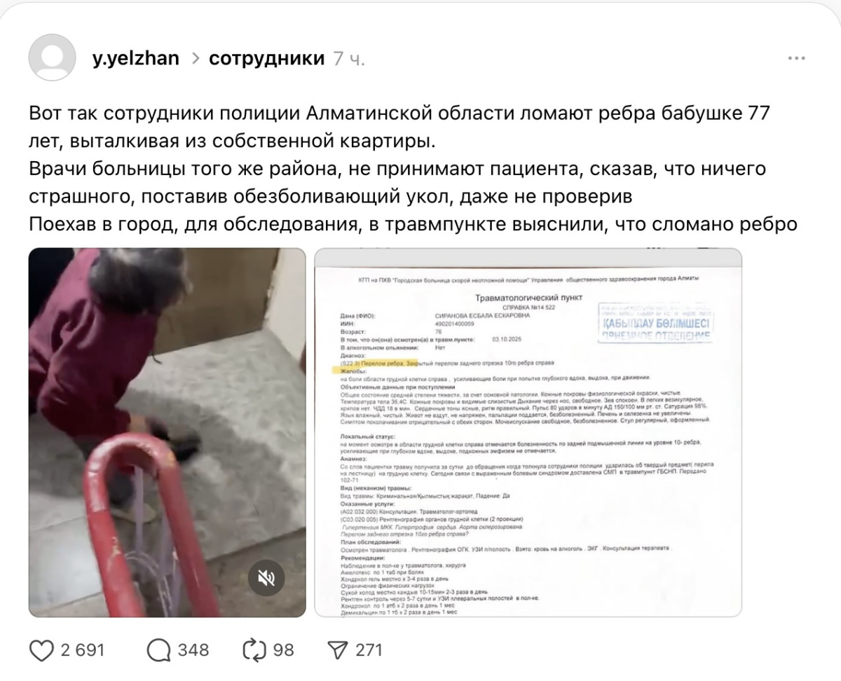 По утверждению автора поста, врачи районной больницы отказались принять пострадавшую, ограничившись уколом обезболивающего. Родственники позже доставили женщину в городской травмпункт, где медики диагностировали перелом ребра. В подтверждение автор выложил снимок медицинской справки.