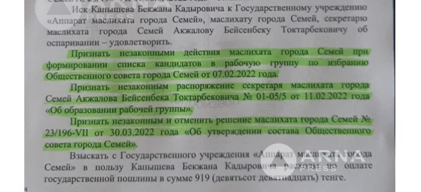 Сообщается, что специализированный межрайонный административный суд № 2 признал законными исковые требования семейчанина Бекжана Капышева к маслихату города.