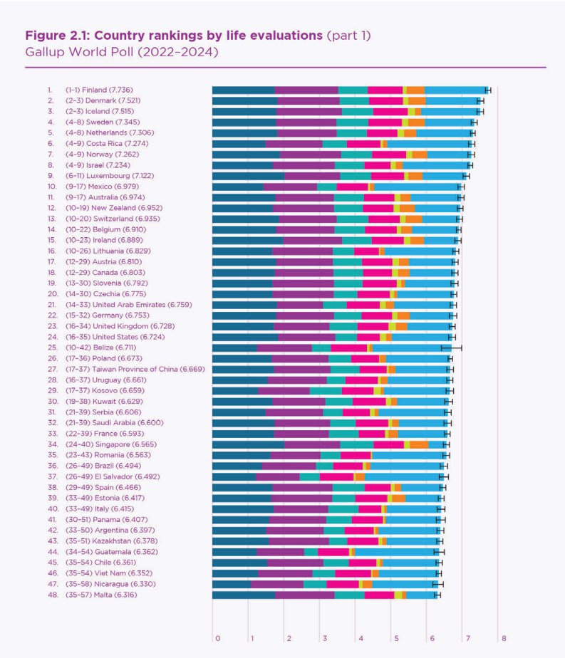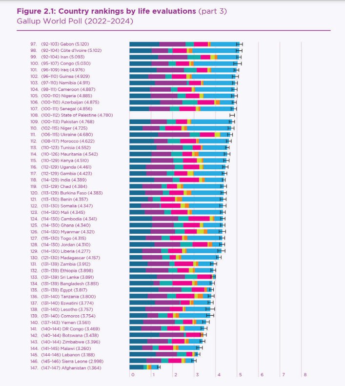 Лидером рейтинга восьмой год подряд остается Финляндия, за ней следуют Дания, Исландия, Швеция и Нидерланды – эти страны традиционно остаются в топе самых счастливых. В то же время, Ливан, Сьерра-Леон и Афганистан оказались на самых низких позициях, отражая сложную социально-экономическую ситуацию в этих странах.