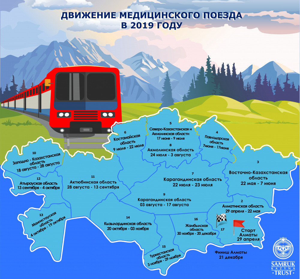 В данный момент медицинский поезд прибыл в Павлодарскую область, где в течение девяти дней посетит 10 отдаленных станций. После этого, поедет в северный и западный регионы, и завершит свой маршрут в южном Казахстане.