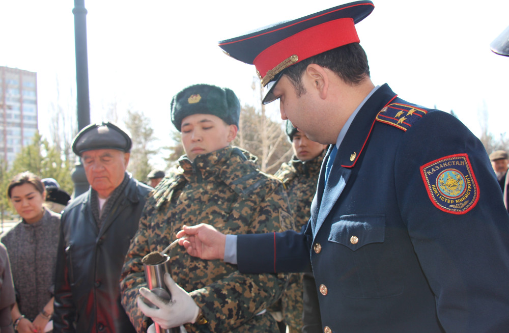 В церемонии возложения горсти земли в памятную капсулу у Мемориала Славы приняли участие стражи порядка, военнослужащие и почётные жители города Усть-Каменогорск. Торжественным маршем под звуки военного оркестра солдаты национальной гвардии передали капсулу для отправки в Российскую Федерацию. После чего был произведён оружейный залп в честь воинов-победителей. Участники мероприятия возложили венки и цветы к Мемориалу Славы. Память погибших почтили минутой молчания.