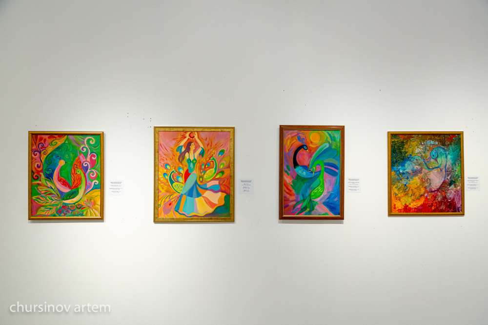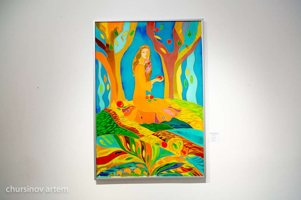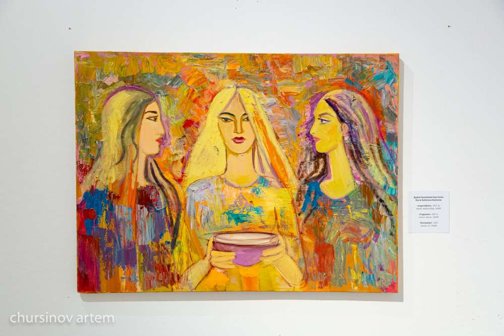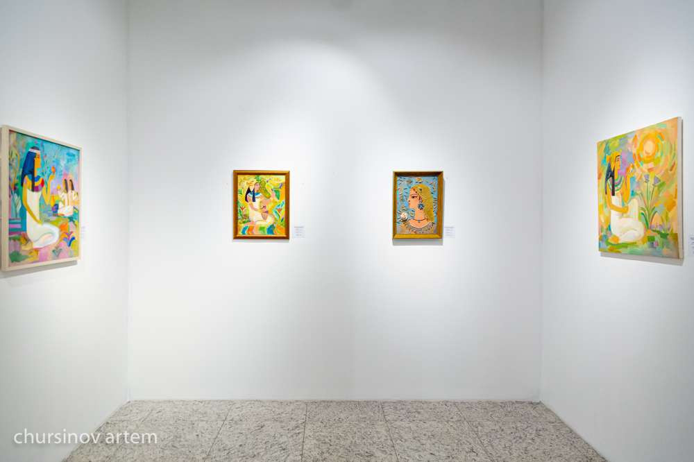 "Здесь на всех работах присутствуют изображение девушки в анфас — это напоминает изображения на древних египетских рисунках. Тоже яркие, сочные тона, свойственные стилю автора", — поясняет Анна Ткаченко.