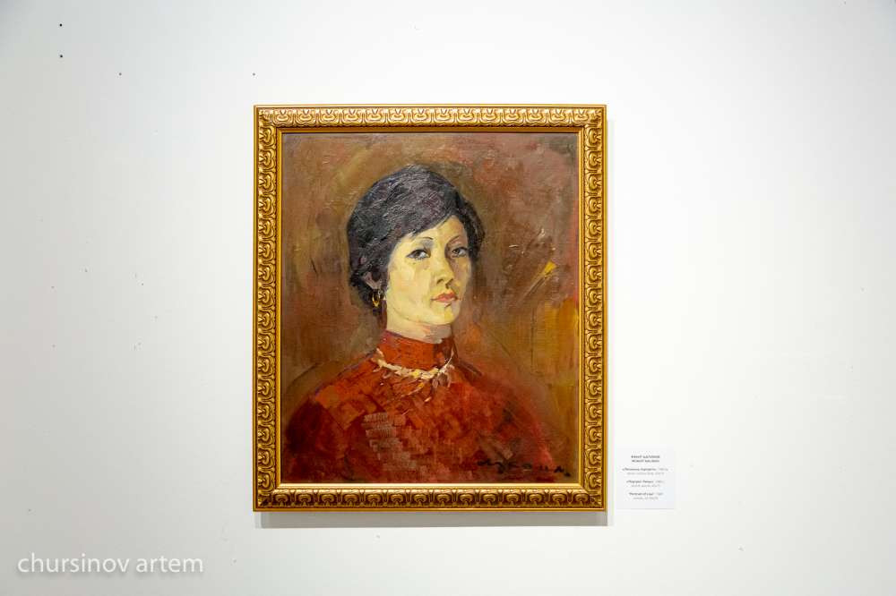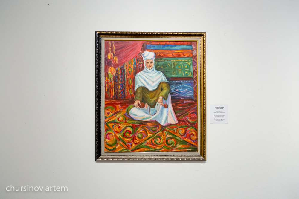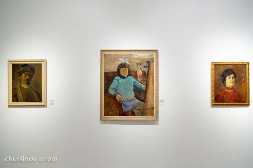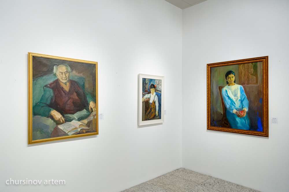 Первые работы, которые мы видим, написаны Мухитом Калимовым. В них художник показывает нам известных казахстанских личностей, а также портреты своих близких родственников.