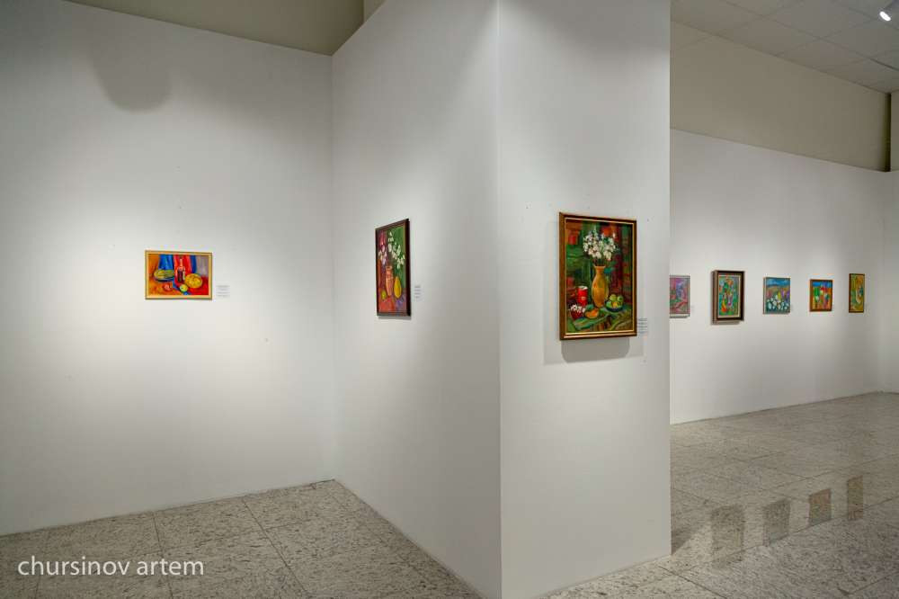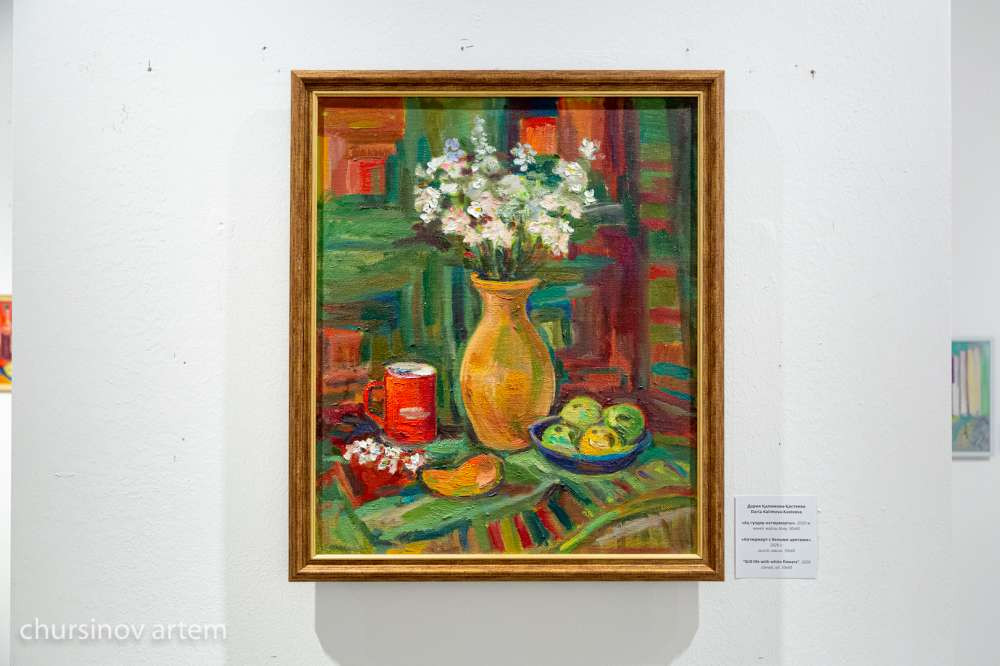 Следующая часть экспозиции посвящена натюрмортам — одному из излюбленных жанров Дарии Калимовой-Кастеевой. На одной из этих картин на переднем плане, мы видим, как художница старательно прорисовывает керамический кувшин, в котором собраны полевые белые цветы. Рядом посуда, чаша с фруктами, и будто случайно упавшая небольшая ветвь белых цветов.