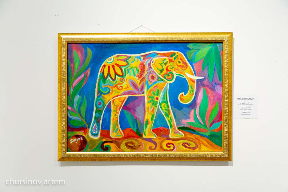 Одна из таких работ так и называется "Индия". В центре изображен слон, расписанный цветными узорами, орнаментами, что как раз свойственно индийской культуре — так как яркие цвета у них ассоциируются с жизнью, с самим циклом жизни.