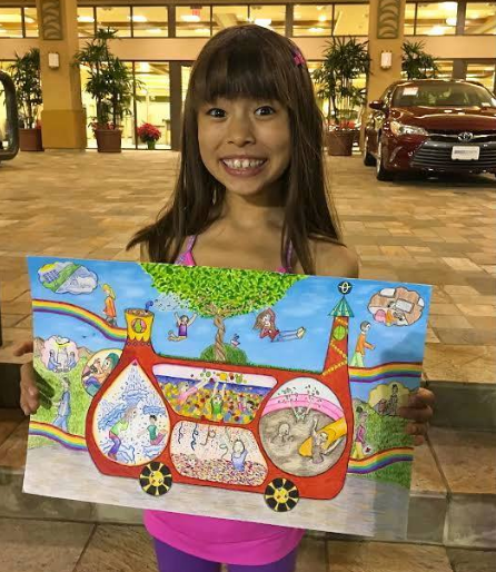 Немного истории. Маленькая, но талантливая художница из нашей страны, живущая сейчас в Америке, приняла участие в конкурсе «Машина мечты от Тойоты» и прошла в первые 30 финалистов из 831 000 участников со всего мира. Она была удочерена Кэрол Миддлтон. По словам Кэрол, Айгерим унаследовала художественные способности от своей биологической мамы. Девочка прошла в финал конкурса и уже в августе летит в Японию на церемонию награждения.