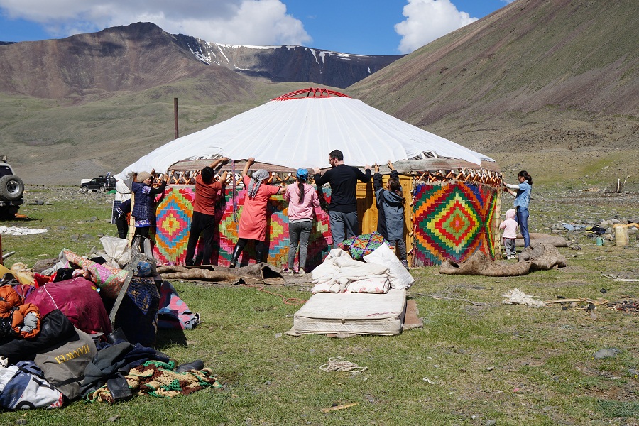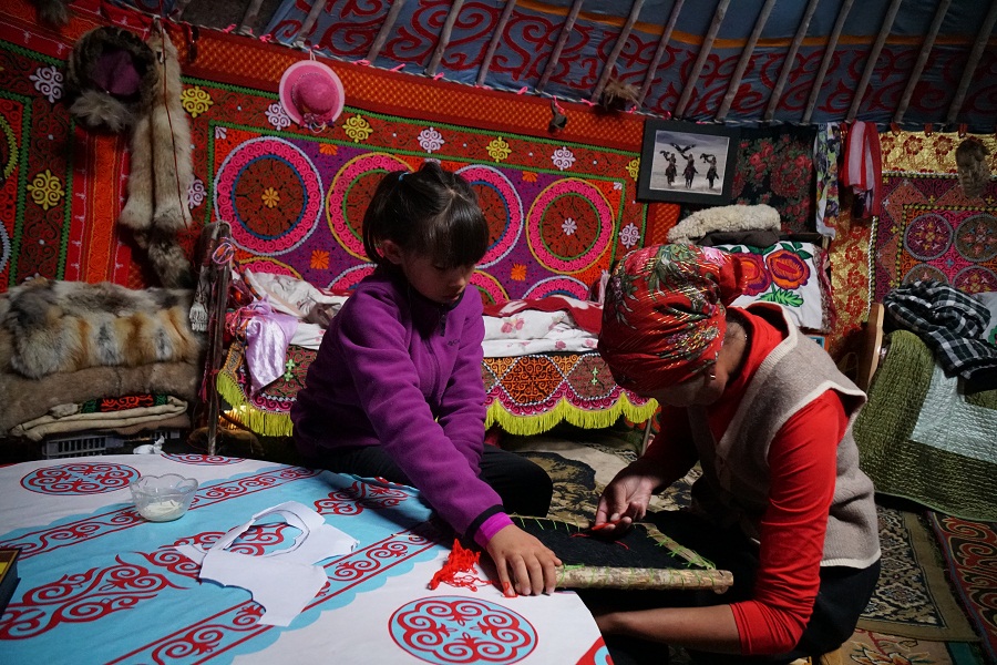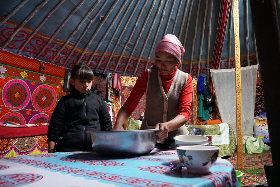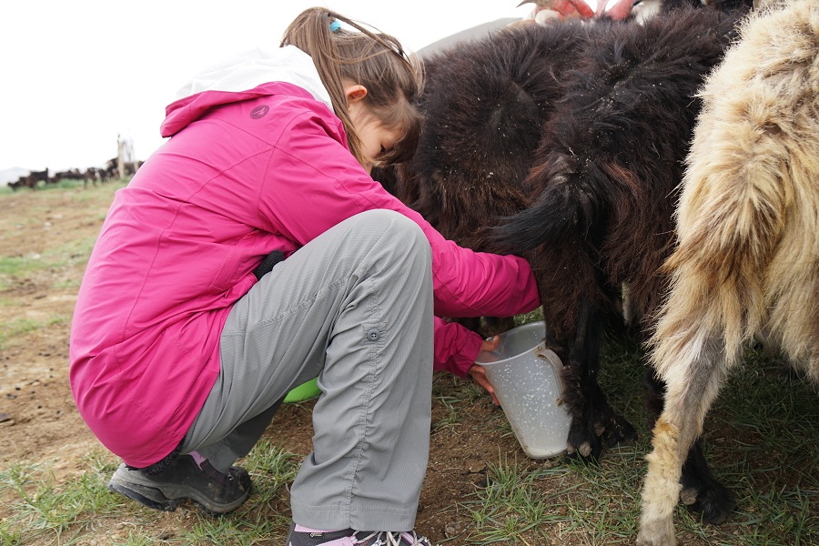 Кэрол: Мы отправились туда, чтобы Айка узнала больше о своей родной культуре и наследии. Она научилась вышивать казахские орнаменты, печь баурсаки и шелпеки, пасти скот, мы даже помогали строить юрту.