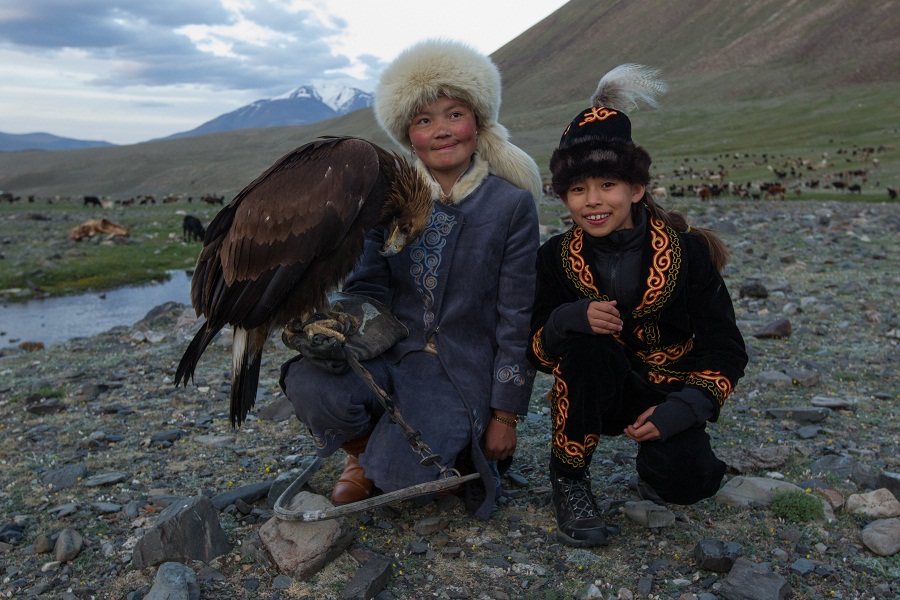 Айгерим: Основой для охоты является поиск своего орла. Сначала нужно выйти в горы с биноклем и найти гнездо орла с орлятами. Как только гнездо найдено, нужно, соблюдая осторожность, подняться в гору, иногда очень крутую. Добравшись до места, охотник забирает орленка из гнезда. Желательно найти женскую особь, так как самочка более активна в охоте, нежели мужская особь. Забрав птицу, возвращаемся в юрту. Заботимся о птенчике, растим его, кормим здоровой пищей, и как только он становится достаточно взрослым, с орлом можно выходить на охоту. Айшолпан 13 лет, она очень хорошая и трудолюбивая. Предпочитает одеваться в свою национальную одежду. Отец Айшолпан – потомственный охотник. Его предки издревле ловили орлов и других молодых птиц, обучали их охотиться на диких животных, которых использовали в пищу. Из меха шили одежду. Аул Айшолпан расположен на границе Казахстана и Монголии.