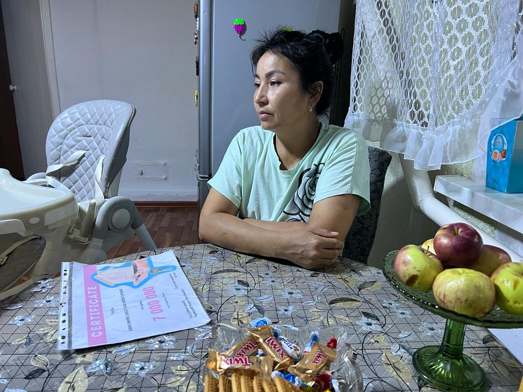 "Приехал Турар, волонтёр. Заснял всё на видео. А у меня страшно что творилось: дача есть дача. Привезли кирпичи, построили печку, утеплили дом. Зиму кое-как перезимовали. Даже подумать страшно, как бы мы без помощи ребят. Одежда, продукты, открыли мне Kaspi. Благодаря такой экономии я открыла на всякий случай депозит. Когда родился ребенок, подарили одеяльце-кокон для выписки, стульчик, ванночку… Но самое главное, сразу после праздника Ораза айт, 1 мая вручили сертификат на семь миллионов, потом еще один миллион добавили. И мы оформили эту квартиру", — рассказывает Сандугаш.