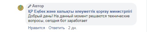Немало удивило пользователей соцсетей и объяснение Аскара Жумагулова насчет нерабочего состояния Telegram-бота по приему заявок на выплату 42500 тенге. Этот сервис был анонсирован 1 апреля министерством труда и соцзащиты населения. Но казахстанцы до сих пор не могут воспользоваться ресурсом, так как чат-бот находится в нерабочем состоянии. Все эти дни люди безуспешно пытаются прорваться по указанной Telegtam-ссылке. На их вопросы ведомство отвечает, что произошли технические проблемы и всё вот-вот заработает.