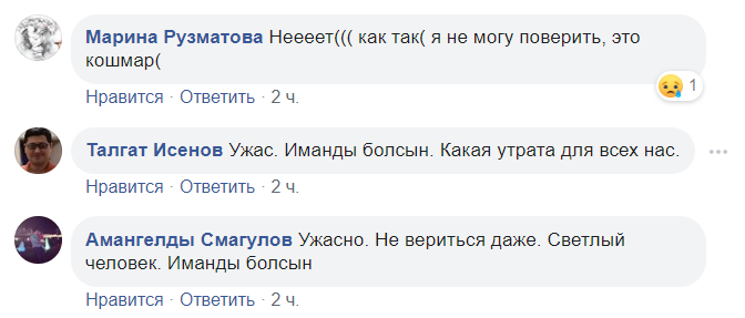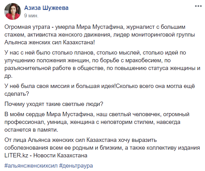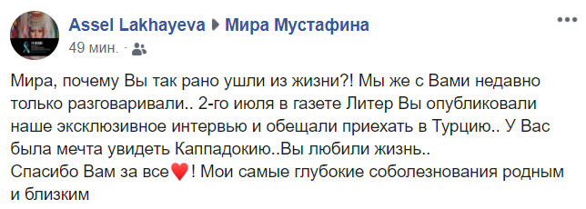 "Тяжело писать про Мирочку, что ее больше нет... рука не поднимается... Не верится... Тяжело, невыносимо это осознавать... Мирочка была прекрасным человеком, прекрасным журналистом, прекрасным другом, подругой! Она всегда умела поддержать тебя, когда тебе было тяжело, всегда могла подбодрить, сказать что-то хорошее, обнадеживающее, всегда умела найти какие-то теплые задушевные слова, от которых становилось так хорошо на душе... В ней было столько хороших человеческих и профессиональных качеств, ее все ценили, уважали, дорожили ею..." - написала наша коллега Торгын Нурсеитова.