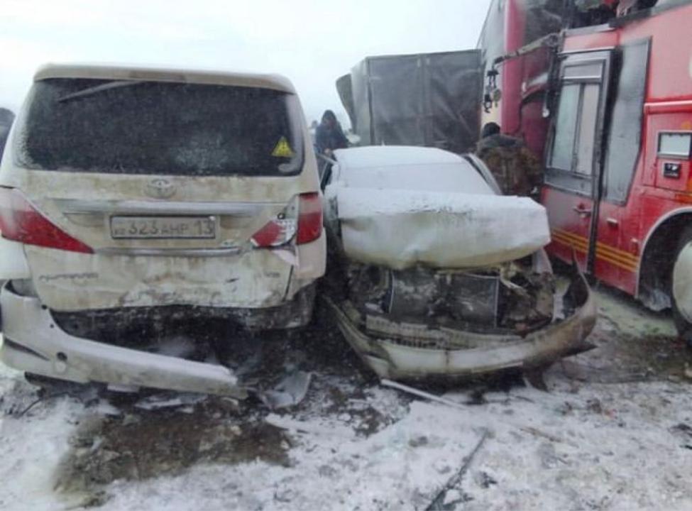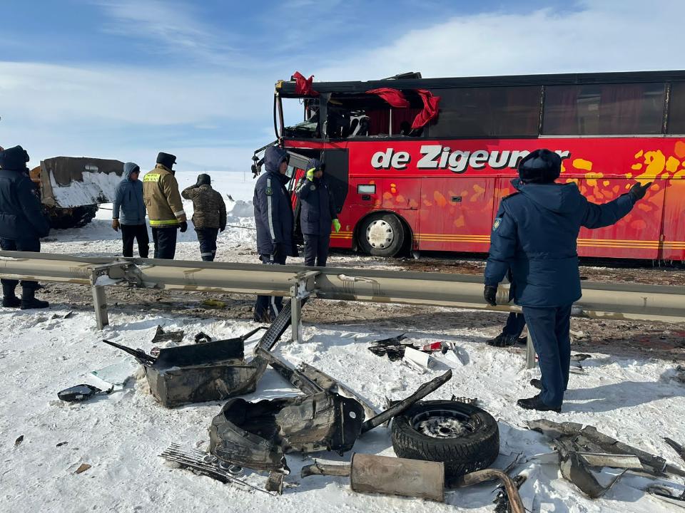 Массовая авария случилась в 10:47 на 567 километре дороги "Западная Европа – Западный Китай" возле села Нурлыкент из-за гололёда, ограниченной видимости и метели. На трассе столкнулись четыре автобуса, четыре грузовых авто и 18 легковушек.