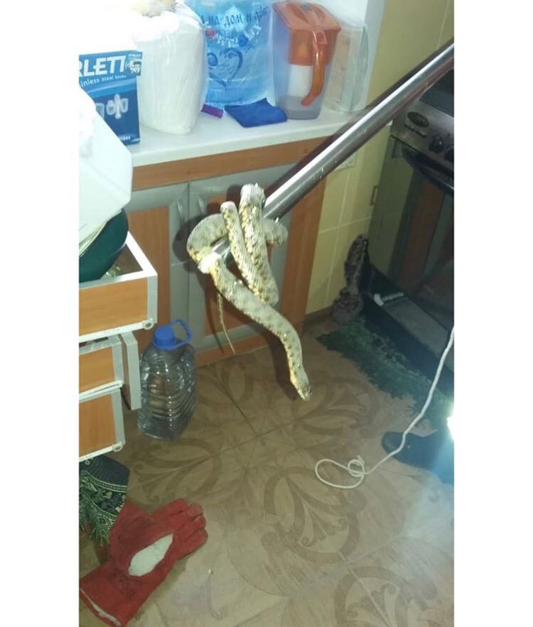 "Сегодня ранним утром моей бабушкой была обнаружена на кухне в центре комнаты змея, которая моментально заползла за печь. Сказать, что мы были шокированы - ничего не сказать! Не долго думая, я позвонила в службу спасения по номеру 112 и сообщила о нашей находке. Служба приехала довольно быстро, но змея как-будто испарилась! Не найдя незваного гостя служба уехала", - поделилась женщина в паблике skandal.krg.