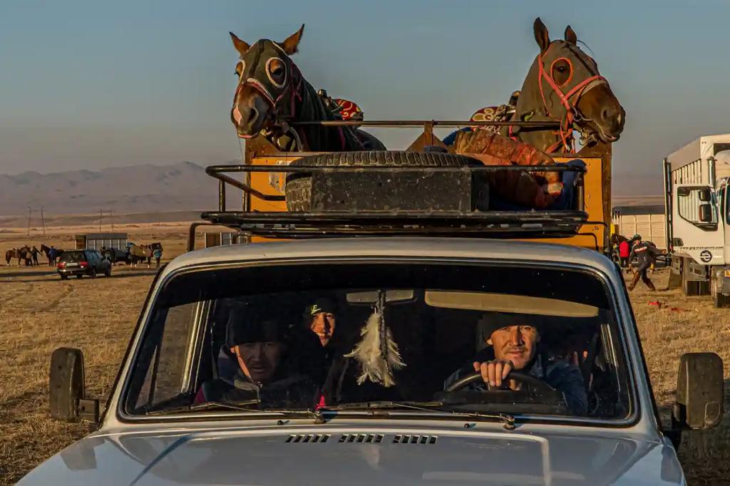 Например, на этой фотографии запечатлены мужчины, возвращающиеся после национальной игры в кокпар в Таразе. Кокпар — это душа кочевого народа, где спокойствие и сдержанность сменяются азартом и горящими глазами.
