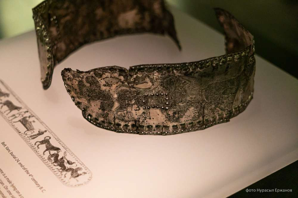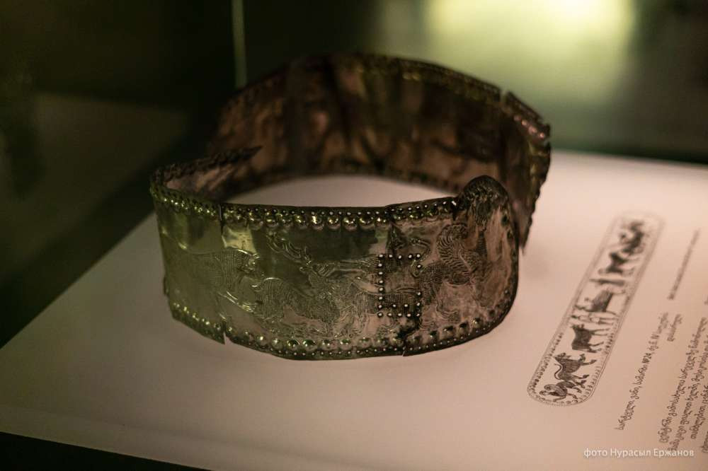 "Это колхидская диадема. Таких диадем было много там найдено. На ней изображена борьба льва с быком, в которой лев побеждает. То, что изображено наверху — зеркально отображается внизу. У нее такой большой объем, потому что они сначала надевали головной убор и потом сверху — эту диадему. Носили их мужчины и женщины", — рассказывает работница Нацмузея.