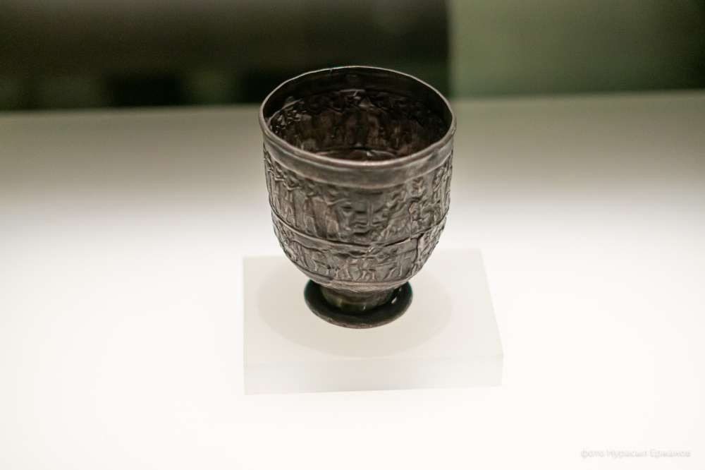 "На серебряной чаше изображены мужчины, одетые в маски, в руках они держат чаши и направляются к алтарю, где восседает бог плодородия. Это сцена жертвоприношения. Чаша датируется II тысячелетием до нашей эры", — рассказывает сотрудница музея.