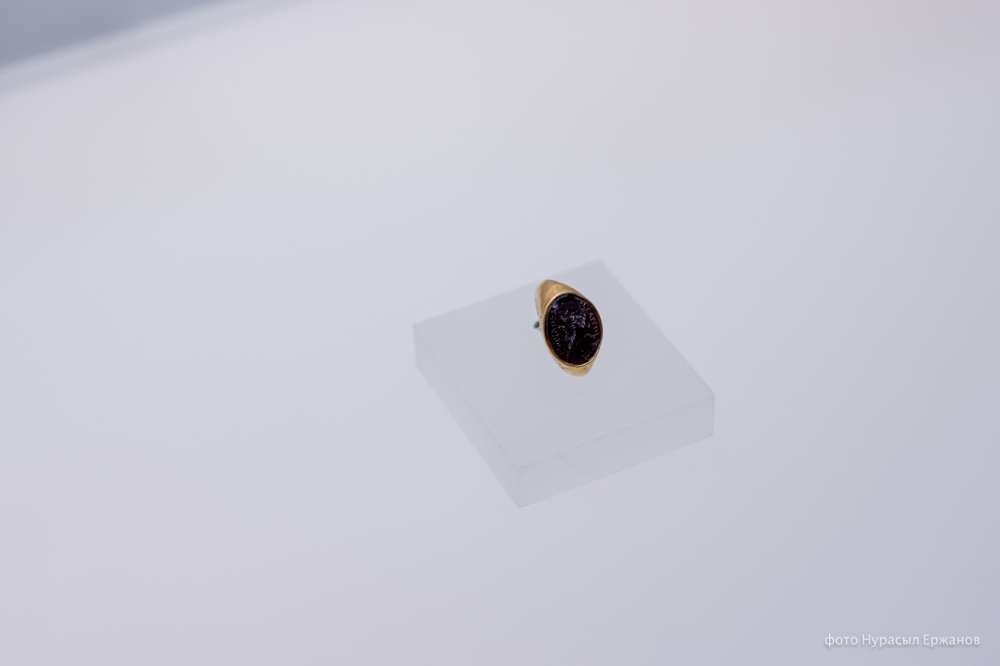 Далее представлены экспонаты из мужского погребения. Здесь есть перстень, на котором изображена женщина и имеется надпись на греческом языке. Видны также отдельные элементы диадемы.