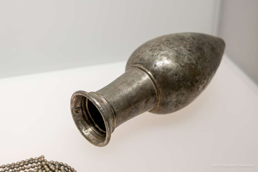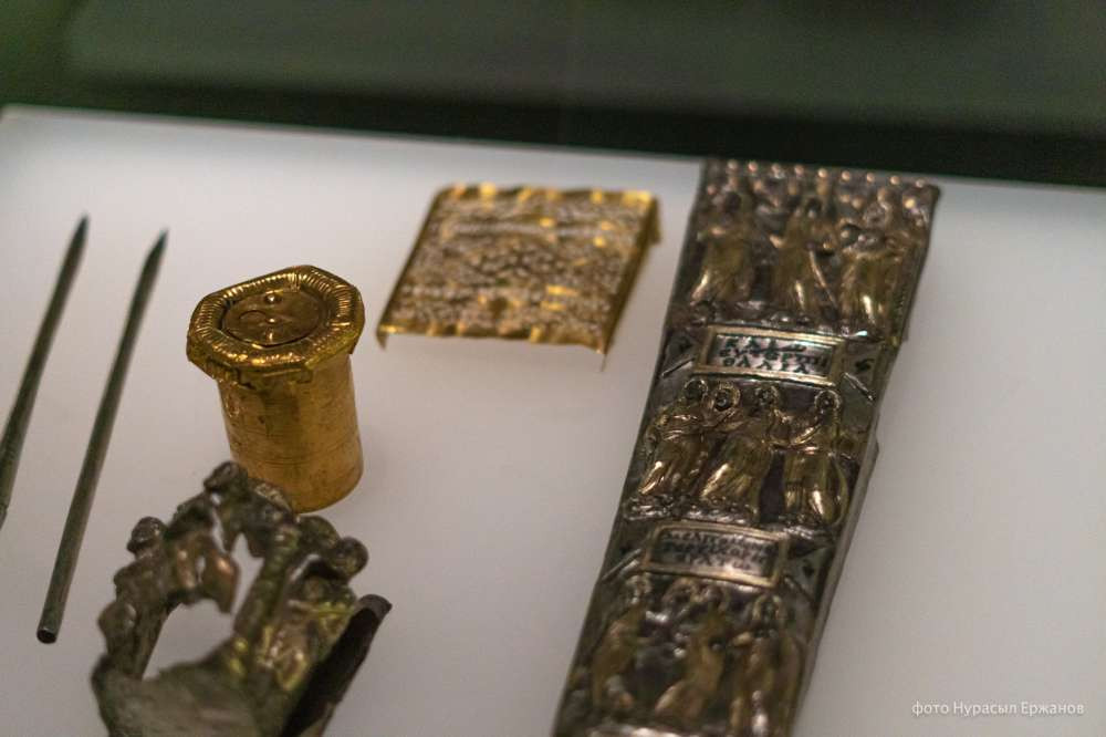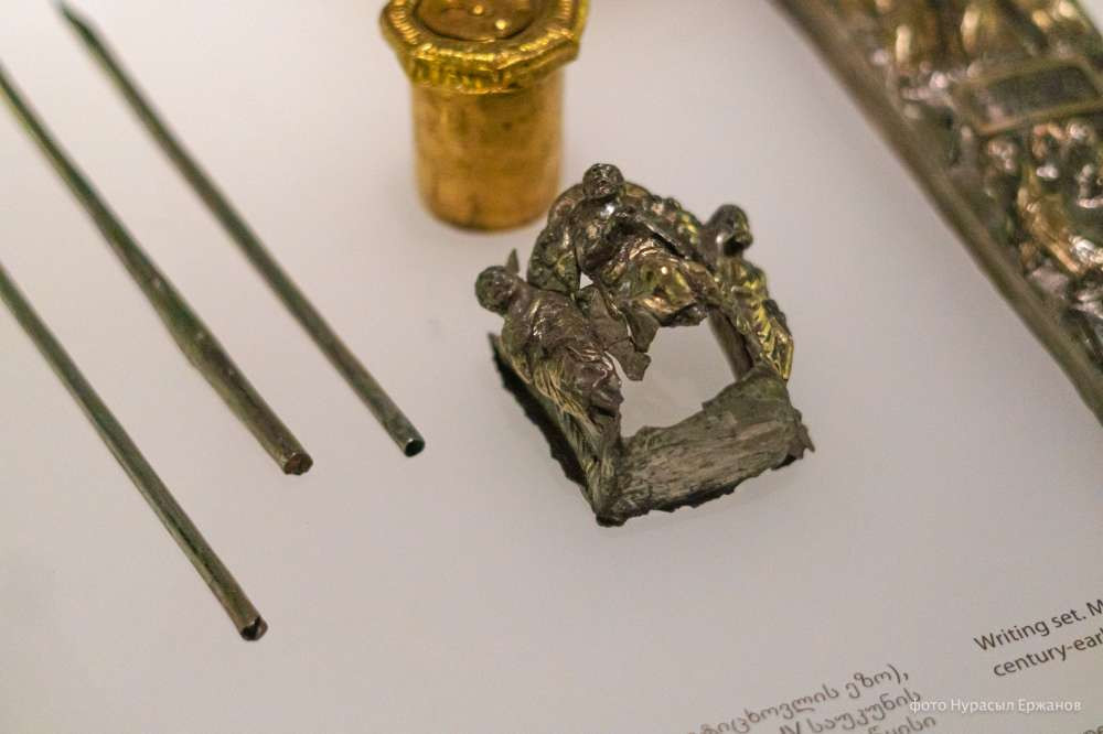 "Во Мцхетах есть большой кафедральных собор, в его дворе велись ремонтные работы и случайно было обнаружено небольшое погребение, где, в том числе, был найден и этот комплект. Там есть чернильница, серебряные ручки. На верхней части пенала изображены девять греческих муз Аполлона. Говорят, что это передавалось из одного поколения другому. Набор датируется IV веком нашей эры", — рассказывает экскурсовод.