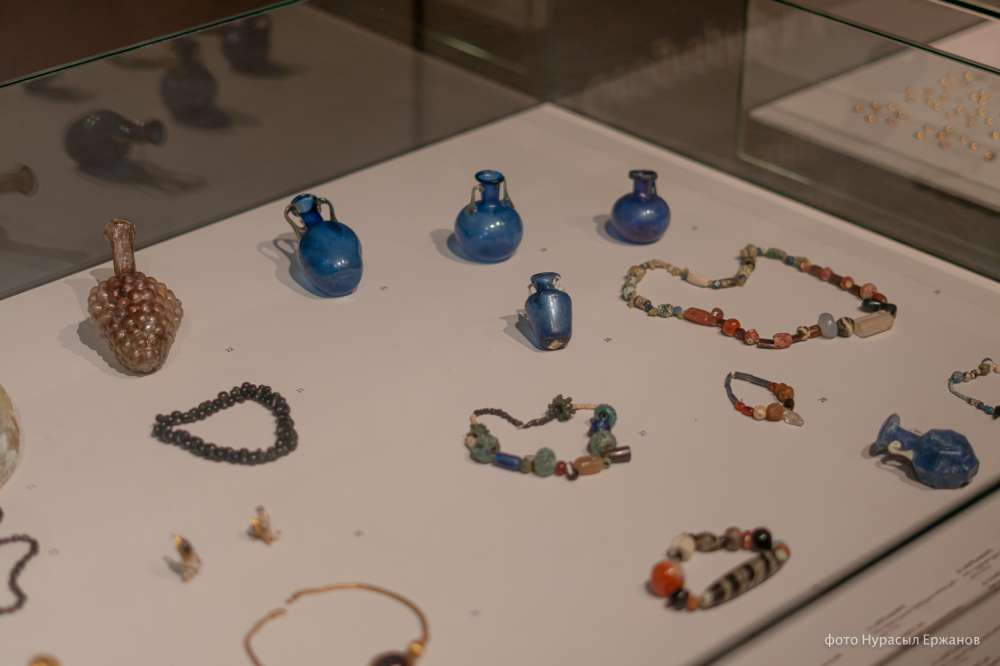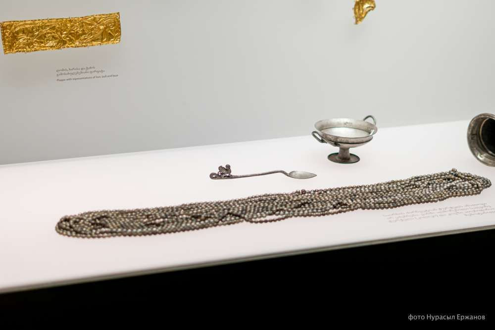Далее можно увидеть серебряную посуду. Есть здесь и стеклянные бусы, которые были сюда завезены, так как стекло тогда в Грузии не производили. В то время стекло было предметом роскоши.