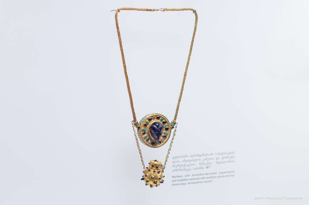 "Говорят, что эти курганы в течении многих веков часто обворовывали. А это было найдено сзади, видимо это была застежка. Вообще, археология не такая точная наука и есть несколько возможных интерпретаций. Может это было сделано в Египте, может быть — в Персии, или же это сделали наши колхидские мастера. Последний вариант тоже возможен, так как гранаты, которые есть на изделии, характерны для колхидской культуры. Гранаты — это для нас символ плодородья", — рассказывает экскурсовод.