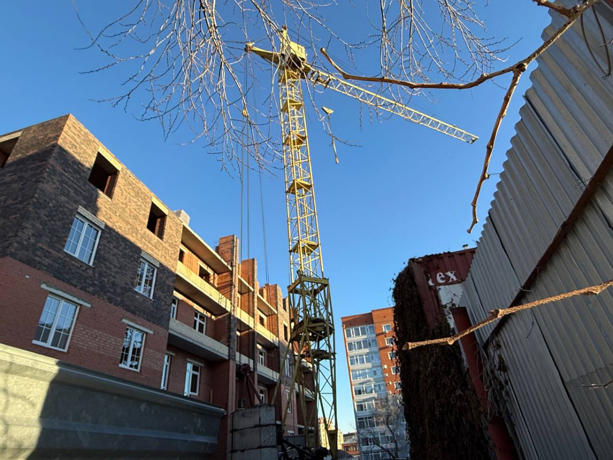 Сейчас стройка на объекте выглядит застывшей: большой башенный кран не работает, а дом замер на уровне четвертого этажа. Хотя некоторые окна уже застеклили и часть балконов почти полностью готова.